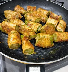 甘長唐辛子の肉巻きを作ってみました。 ■材料 甘長唐辛子、豚バラ肉、玉ねぎほりにし(スパイス)、塩、胡椒、酒、金龍(焼肉のタレ)、小麦粉、サラダ油 ■作り方 ①甘長唐辛子のヘタを切り落とし、縦に切り裂き中のワタと種を出す。②櫛型に切った玉ねぎをサラダ油を入れたフライパンで、しんなりするまで炒めて塩、胡椒して冷ましておく。③甘長