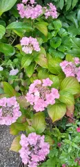 玄関前の紫陽花 玄関前のピンク系の紫陽花達が咲いてきました。 ピンクに黄緑の縁取りが。ウエディングブーケ💐 巡恋花