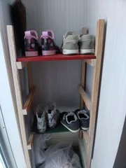 玄関のどうしようもない隙間、ゴミ置き場にピッタリな… 端材と廃材で子供の靴置き場を作りました。固定していないので邪魔になったら別のモノに変身予定、でも一番下は結局ゴミ置き場です!