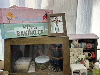 私のデスク周りです😊 ワークショップで作ったブレッドショーケースに、マスキングテープラック。B&Bのボックス重ね使いしてます。 先日、ステンドグラスを作ってみたくなり体験してきた作品を飾るのに、ココが一番落ち着きました😅