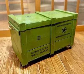リンゴ箱をリメイクしました ■作品内容よく行くスーパーで、ご自由にお持ち帰りくださいだったリンゴ箱をアンモボックス風にリメイク、スプレー塗料入れにしました。■こだわりポイント重さがあるので底と側面に補強材を付け、蓋も作りました。カインズさんオリジナルのステンシルシートを使って、アンモボックス風にステンシルしてみました。キャスタ