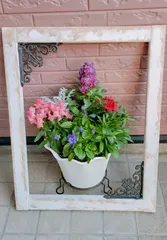 寄せ植え用アイアンフレーム カインズさんに頂いたホワイトの塗料を使ってアイアンフレームを作ってみました。周りはカインズさんの水性塗料を薄めて汚しを付けてアンティーク風にしてみました。お礼が遅くなりましたがカインズさんありがとうございました😃アイアンフレームのオススメは中に寄せ植えを飾ります。花を絵を見ているようになります。