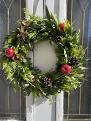 フレッシュリーフのクリスマスリース 園芸店でのクリスマスリース作りに参加してきました☺️ フレッシュリーフは久しぶりなのでちょっと苦戦💦早速玄関に飾りました杉の良い香りがします💚