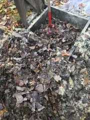 こんにちは、totoroです。今日は2週間前に木枠コンポストに仕込んだ落葉の切り返しをやります。これが結構重労働なんです。ついでに庭に散ったサクランボの葉っぱも集めて来ました(笑)ますは木枠を外して落葉を一度取り出して混ぜます。気温は7℃なんですが、じわっと汗ばんでしまいます。次に米糠をたっぷり振り