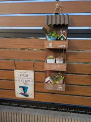 ここ半年ほどイベントごとで忙しくてなかなかWSに参加できずにいましたが、久しぶりに参加してとっても楽しかった〜!ドリルでの穴あけやステンシル、4色好きな塗料を選んでの色塗りなど、小さい作品ながらもいろんな作業を体験できて大満足。雨に濡れないように、庭ではなく玄関先に飾ることにします。WSの作品が3つ