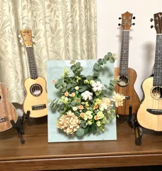 フラワーフレームとウクレレ達 かかっこいい額が出来上がりました。造花でも立派に見えます。まわりのウクレレ達が素敵な音楽を奏でているようです💖