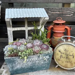 ■作品内容自作の木製プランターを持ち込みして多肉バイキング寄せ植えしました。■工夫ポイント鉢から溢れるほどの土を棒倒しするみたく盛る盛る₺ ʓ ₺ ʓ🤩工夫というより反省点多々。。。💧ちょっとの隙間にセダムを入れるのが浅く飛び出てるみたい!?これでもかーっ🌱って押し込まないと可愛くキレイな見栄えにな