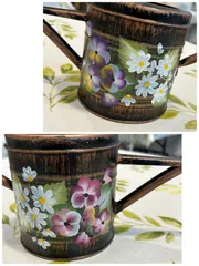 ワンストロークのビオラと、マーガレットのジョーロ うぁーい出来ました。😃 午後1:00〜5:00位までかかりましたよ。 ずっと座ってやるのも、腰がいたいです。🥹今日の参加人数は6人。 デザインのお花そのものは全然難しくないのですが、ビオラの花びら一つ一つ、微妙に変えていくのが、大変。筆についた、インクを、一回、一回拭き取って、新しく色を作っては、