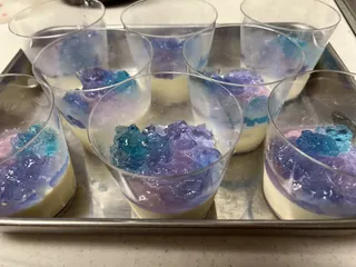 豆乳パンナコッタ紫陽花ゼリー乗せ 皆さんの真似して作ってみました。 ショートブレットを砕いてカップの底に敷き詰め、そこに豆乳パンナコッタを投入。 バタフライピーシロップで作ったゼリーをレモン🍋果汁を入れながら、青、青紫、紫、ピンクの4種類作って、フォークでクラッシュゼリーにして、パンナコッタの上に乗せました。&n
