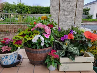 玄関に寄せ植えと 紫陽花 玄関が華やかになりました⤴️紫陽花も咲いてます