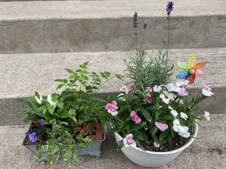 ブリキのプランターの寄せ植え 先日、グリーンWSでブリキのプランターで寄せ植えした苗を二つに分けてみました✨ お花を家にあったプランターに植えて風車のピックを飾り、観葉植物は、追加で購入したもので寄せ植えしてみました💕✨