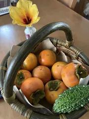 今日の収穫 今日の収穫柿とゴーヤとハイビスカス季節がごちゃごちゃ🤣🤣柿は硬めが好きなので少し色づいたらとちゃって良いのかな?収穫した時は硬かったのに2日でぶにょぶにょ😭これぐらいが好き😊