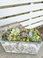 モルタル鉢のお直し♡ 年季の入った、大好きなモルタルプランターも猛暑で酷いことに💦お直し前!全部抜いて、土を足してチマチマ。黄色のセダムを入れると引き締まりますね😊