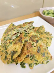 ふわふわニラ玉❣️ ■材料・玉子 3〜4個・ニラ 1/2束・合い挽きミンチ 100gくらい・袋に入った茹でうどん 1/4■作り方①茹でうどんを袋の上から細かく(1cmくらい)刻み、1/4をボウルに入れる(残りは分けて冷凍しておくと次に使えます)②①のボウルに残りの材料を入れて混ぜて、塩胡椒、麺つゆ少量、マヨネーズ少量を