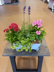 脚付きブリキのダイアンサス寄せ植え グリーンのWS『脚付きブリキのダイアンサス寄せ植え』ダイアンサスが撫子と知りました😂毎回学びです😆⤴️💓花🌸で隠れていますが、ブリキの容器がとにかく可愛い😍💕‼️花が大きくなったら、撫子とラベンダーを大きい容器に寄せ植えし直し、手前にあるのが観葉植物🌿の仲間なので、このブリキに観葉植物を入れると室内