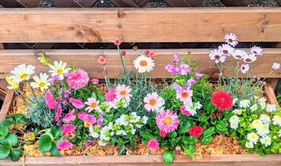 花壇のように植えたくて、フェンス付き木製プランターカバーに直接😊✨寄せ植えしました💕 主役は3種類のローダンセマム🎖ですデージーや、ビオラ、マトカリア、リナリア等をランダムに植えました🌿 リナリアは始めましてのお花🌸だったので嬉しいです🤗💕