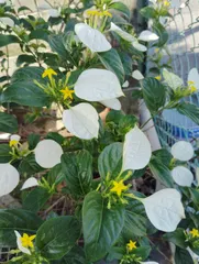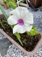 涼やかな白い花🤍 アサガオが咲き始めました。暑さが本番となった今朝、庭を見て回っていたら一輪ずつ花を咲かせているのに気がつきました♪♪それも!みんな白い花!!マンデビラ(サンパラソル)3年目のオステオステムマムバラの名前?わかりません…