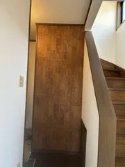 玄関のリフォームのつづき前回までは壁紙をペンキで白く塗ったよ。正面の壁はアクセントにしたくて...壁紙を貼ってみたよ。糊を自分で塗るタイプの壁紙だけど、思い切ってやってみた💪端っこはカッターで切るんだけど、うまく切れてなくて破けたり...だから茶色の絵の具で塗ってみた🤣