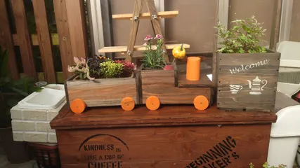汽車型プランターカバーにハロウィンぽく寄せ植え 汽車型プランターカバーにぴったりのプランターWSの帰りにカインズさんで、サイズ合わせながらプランターを買いました。でも😅白しかない❗❗茶色か黒があれば良かったのにぁ〜なければ色塗りましょ💡プライマー塗って エクステリアカラーのモカをぬりました。内側は土の入るところまで外側は全部!秋色クレ