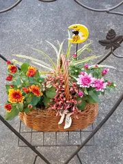 ハロウィンの寄せ植え 9月末のGWSで作ったハロウィンの寄せ植えのマムが咲き始めました✨まだ蕾もあるけど、早く満開になってほしいです😊