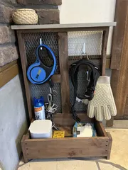 玄関に置いて愛犬用のお散歩グッズ置き場にしています。ネットに色々かけられて便利です。