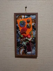 お正月飾り 額縁は100均のもの。土台は虎の柄の生地。羽子板の形に切った厚紙にちりめんを貼り、千代紙、造花で飾りを作り貼りました。