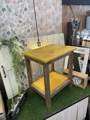 ヘリンボーンサイドテーブル お気に入りの逸品が出来上がりました笑 絶対予約争奪戦になると思っていたのにおひとり様ワークショップを開催させてしまいました。苦手なノコギリもコツを教えて頂きちょっと好きになりました☺️ 木目重視で塗装はニスを持ち込みで使わせていただき好みの仕上がりになりました✨ ヘリン