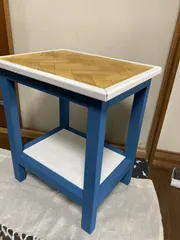 ヘリンボーンサイドテーブル 今日はヘリンボーンサイドテーブルのWSに参加してきましたなかなか手強く、完成までに5時間くらいかかってしまいましたが、達成感MAXで充実したWSでした色はブルーを使いたくて、持ち込みし3色にしました