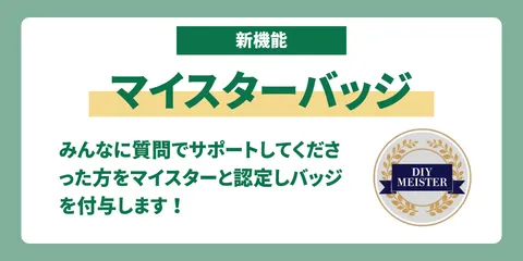 【機能追加】マイスター認定バッジが追加されました 新機能「マイスターバッジ」が追加されましたのでご案内いたします。マイスターを目指そう!「みんなに質問」メニューにて、コミュニティのみなさまのサポートに貢献してくださった方を「マイスター」と認定し「マイスターバッジ」を付与することにいたしました!🏆「みんなに質問」メニューでの回答に対し、質問したユーザ