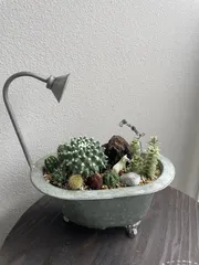 ドライガーデン ■作品内容ワークショップで作った多肉とサボテンのドライガーデンです■こだわりポイント容器がとにかくかわいくて、アドバイスを受けながらサボテンがシャワーを浴びている感じに寄せ植えしました。流木で多肉とサボテンをなんとなく仕切っていて多肉に水やりする時にサボテンの方に水がいかないようにしています。羊のガ