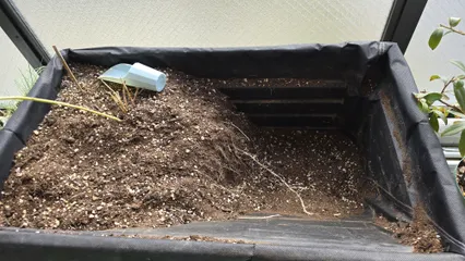 プランターBOXの土の入れ替えとその判断🧐 ■材料・スコップ・収草袋・新しい土 ■作り方①収草袋を広げておき、ベジトラグ(プランターBOX)の右半分の土を上から順番に少しずつスコップですくって入れていきます。右半分の底まで土をすくってしまって、コガネムシなどの幼虫がいなければ、左半分にも幼虫がいない(筈)ということなのでそのままにし