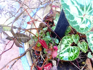 いつ植えたかすら覚えていない、お買い得品だったガーデンシクラメンです一緒にいるワイヤープランツと初雪かづらがボーボーなので植え替えようとしたら、ちっちゃいシクラメンの葉がいっぱい😆増えたのかな?黒い棒はソーラーライトですが、そちら側にもいっぱい葉が出てます植え替え、やめておこう😁