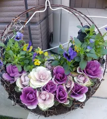 残りの葉ボタン ビオラもご近所の方から一ケースいただいたので、葉ボタン、ビオラでハンギングバスケット、ハートのバスケットにも土が落ち着いたらハンギングできますね、こちらには挿し芽した白のビオラとノースポールも入れました😊💗 もらったミニ葉ボタンたち💗本来11月、12月に作る葉ボタンのハンギングバスケット、