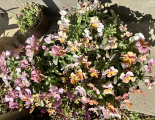 優しい色合い お値打ちの苗救出しました。ウェンティの優しい色合いにシュシュの約束と言うビオラ合わせて植えました。花台もお値打ち品から