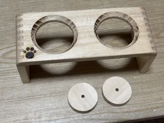 フード台 ご飯皿に高さを出して食べやすくと、桐の板に穴を開け、脚をつけました。 角は丸く削ってあります。足跡マークはコテで焼き付けしました。 環境対応塗料のウレタンニスを塗って仕上げてあります。 端材の丸は何に使いましょうか(^^) (夫作品)