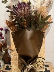 ドライフラワーアレンジ 職場の上司にお誕生日プレゼント🎁としてドライフラワーアレンジを作りました✨ レザーの土台は、私の友達の手作り✨レザーでポーチやサコッシュなど色々な素敵なものを手作りしています😊 メッセージも刻印してもらいました✨友達とのコラボ作品✨素敵に完成して嬉しいです🥰