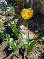 チューリップ4号(1年目のビリディ咲き) 昨年10月22日の作品投稿(リンク→ https://diy-square.cainz.com/announcements/bfi2b9i5foqgjyr8 )で球根植えしたビリディ咲きチューリップに花が付きました。縦縞が特徴なんですかね。7球植えてるんですが、あと3つくらい花が見れそうかなー?って