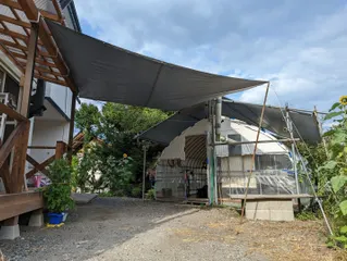 サンシェード BOXの車をそのまま突っ込むことが出来、雨の日の乗降にとても重宝。常設なので BBQも気軽にできます!春秋には、この下に椅子を出してのんびりするのも気持ち良いものです。 ロープの結節は、自在結び。これが、単純なのですが緩まないです。正直、舐めてましたが昨年、6か月近く風雨に耐えてくれました