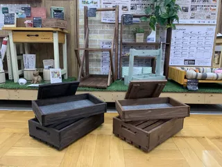 前橋小島田店から9月開催レギュラーWS「ガーデンBOX」のご紹介♪ BOX」のご紹介です♪ 蓋、フルイ、ボックスの3点セット✨そして翌月開催の「フィールドカート」とあわせて使える作品となっています💕 ガーデニングにはもちろん、お子さまのお砂場あそびや、多肉やサボテンのディスプレイ台としてもオススメです☘️ 取手の
