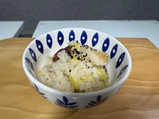 丸ごと一本のさつまいもご飯🍠🍚 今日の朝食はさつまいもご飯です🍠🍚おこげも出来て美味しかったです😋💕✨🍠丸ごと一本ドーン💥と入れて炊き上がったら縦横切れ目を入れてバター🧈を挟みました😋