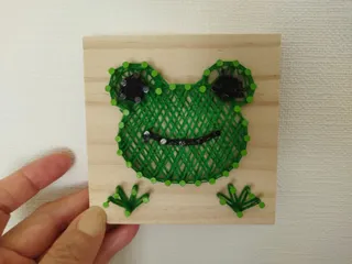 カエル🐸 カインズさんのイベント参加しました釘と糸🧵簡単に出来そうと思いきや😥釘を真っ直ぐと木材の節の硬いところ😔糸の運び方思い通りいかなくて…😁約2時間かかっちゃいました釘の色を変えるの気がつかず😳後から黒マジックで塗りましたー😁