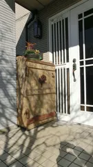 玄関横のピッタリサイズの木製物置 玄関横の柱と外壁の間にピッタリ入る一枚ドアの物置を作りました。上に鉢物を乗せて来客へのオモテナシ。キャスター付きなので簡単に動かせてタイルの掃除も楽々です。