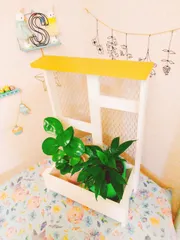 おもちゃカート 12回目のワークショップでは、おもちゃカートを作りました😆いつも茶系が多かった私ですが、今回はおもちゃということもあり、明るめのカラーにしてみました🎵👍観葉植物を入れて、晴れの日は日光浴させてます😆