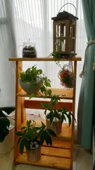 足場風三段ラック 先日、伊勢崎店さんで参加させていただき足場風三段ラック作りました。受付したら、先に来ていた参加者さんにたくさんのバッジからひとつ選んで生枝を書いて付けるんですよと声をかけていただきました。可愛いバッジでテンションも上がり⤴️楽しく作業できました。観葉植物を窓際に上手く飾るラックができて、グリーンたち