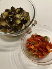 作り置き 今日は、暑かったです。なので、作り置きはレンチンです。ナスの煮浸しとパプリカの南蛮漬け。二つとも実家の野菜、ありがたやー。
