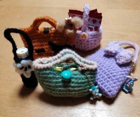 孫のお年玉袋を作って今年は編み物からのハンドメイドスタート…私用も欲しくなりました💕ルル🐶ちゃん型はキズパワーパッドとのど飴入れ・ピンクバスケット🧺型はアポロチョコ入れ🩷ミッキーの手つきはサカムケアの水絆創膏専用ケース👍ジェラトーニ&ステラ・ルーの編み物ケースは大好きなチョコ入ってます🍫🍬