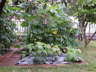 狭い庭の有効活用 ■育てた野菜手前から枝豆、オクラ、ナス、カボチャ ■工夫ポイント 狭い庭の最後のところに網を張り、カボチャを空中栽培しています。カボチャは広がるのでそれを上へ上へと持ち上げます。