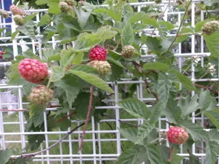 網の塀にブラックベリー ■育てた野菜ブラックベリー ■工夫ポイント 庭の塀の網を利用してブラックベリーを地植えにして絡ませています。うまく絡んで収穫も楽ですよ。