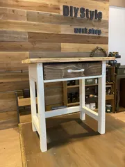 引き出し付きサイドテーブル 昨日WSで引き出し付きサイドテーブルを作ってきました🎶 ノコギリ作業も有り、なかなか時間がかかる私にとって作るのが大変な作品でした💦でも上手に仕上がったと思います😊 色は部屋の雰囲気に合わせて脚をホワイトに💕取っ手は元は黒でしたがホワイトで塗装しました😊色の統一感が出て塗って良か