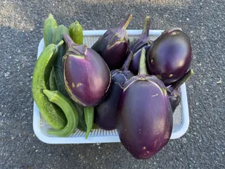 今日の畑の収穫 夏が本格に始まったので、なるべく夕方に水やりをする事にしました。収穫して水やりをするんですが…午前中に畑に行くより蚊🦟がめちゃくちゃ多くて😭😭😭いつもいっぱい刺されて帰ってきます🤣(虫除けスプレーをしっかりしているんですが…) 今日はナス🍆が大きいモノが収穫が出来ました🥰私の手と比べてみま